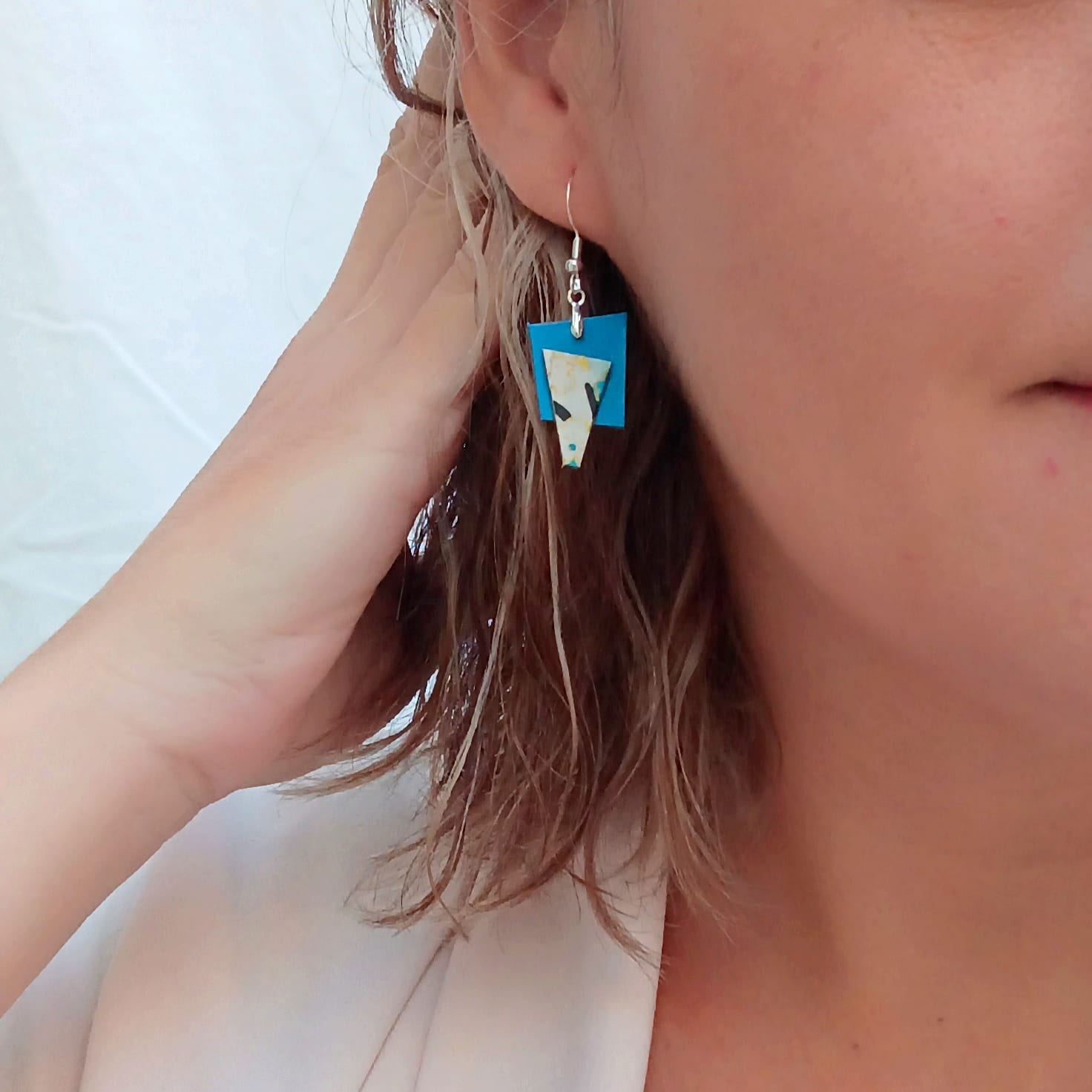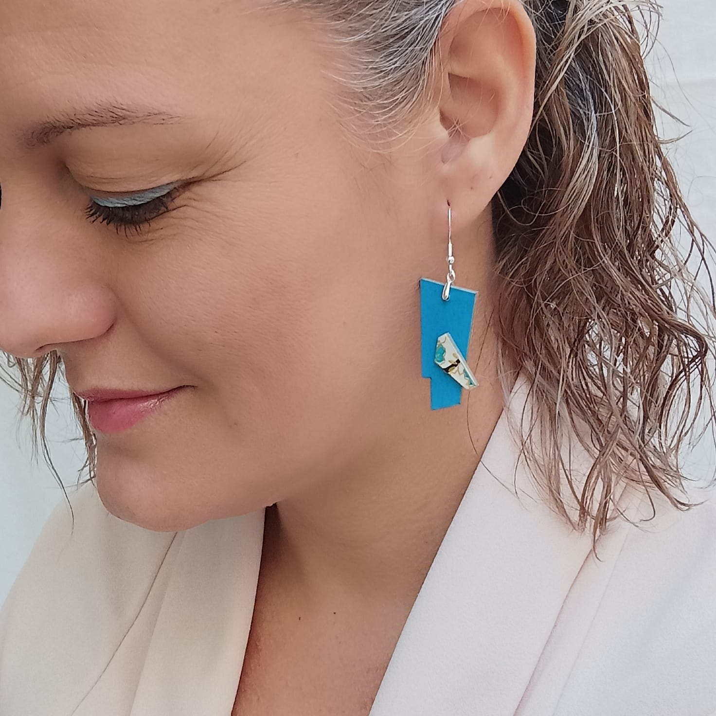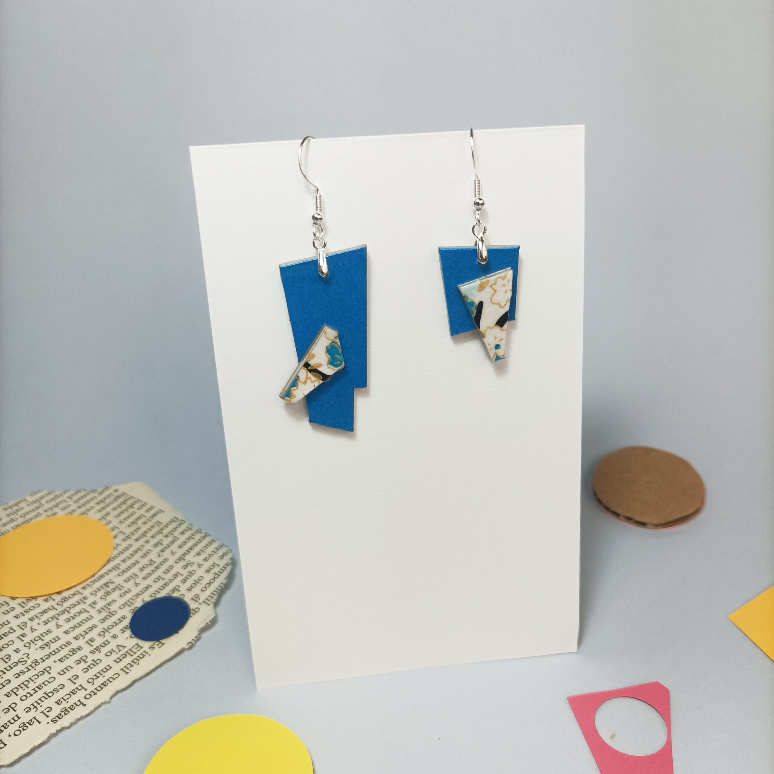 Pendientes hechos con papel cartulina, papel japonés y cartón tratados con resina para hacerlos resistentes a la humedad